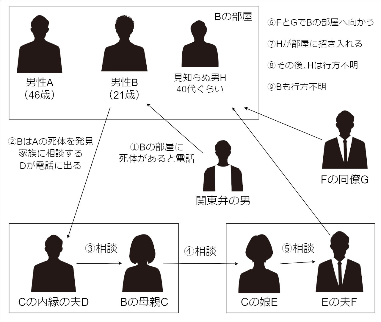 ここから伝言ゲームのように内縁の夫Dは母親Cに相談し、母親Cは娘Eに相談し、娘Eは夫Fに相談する。最終的にFと同僚GがBの部屋へ行く事になる。この時、既に男性Bの所在は不明となっている。