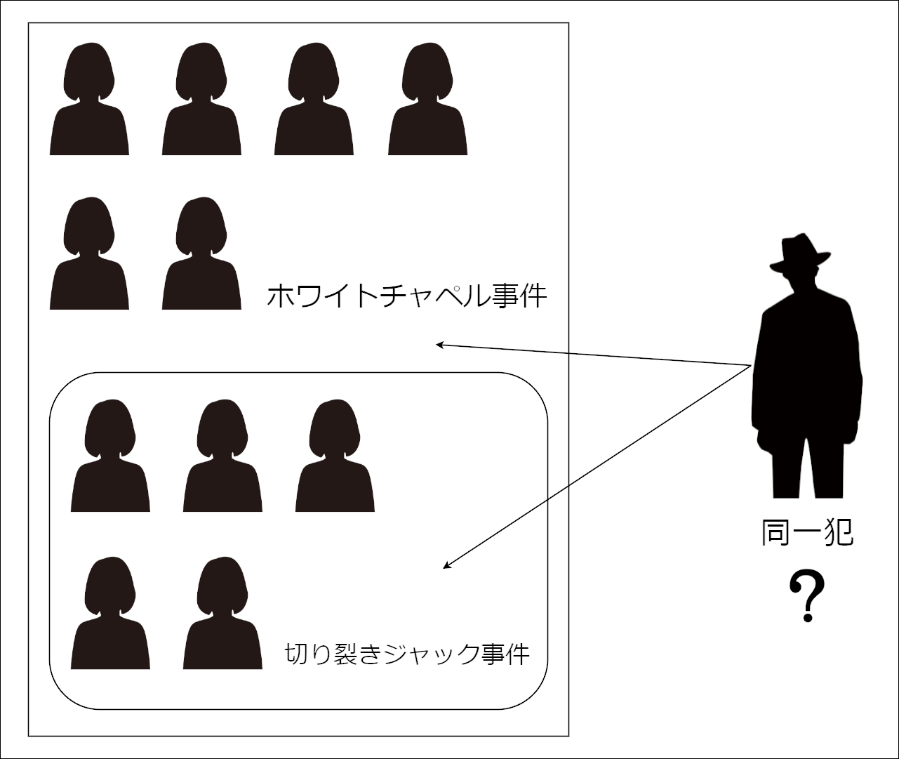 - 被害者5人の職業は娼婦であり、別事件のホワイトチャペル事件の被害者と似ている